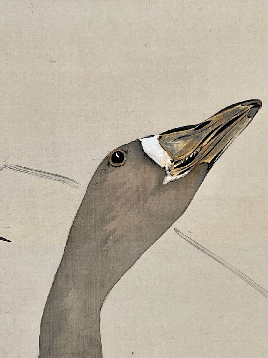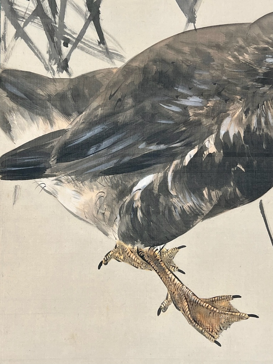 大きく描かれた雁の一瞬の姿を丁寧に描きあげ、芦をスピード感を持って描く事で、写真では表す事のできない絵画の素晴らしさを伝えている優品です。