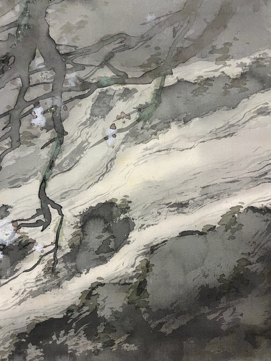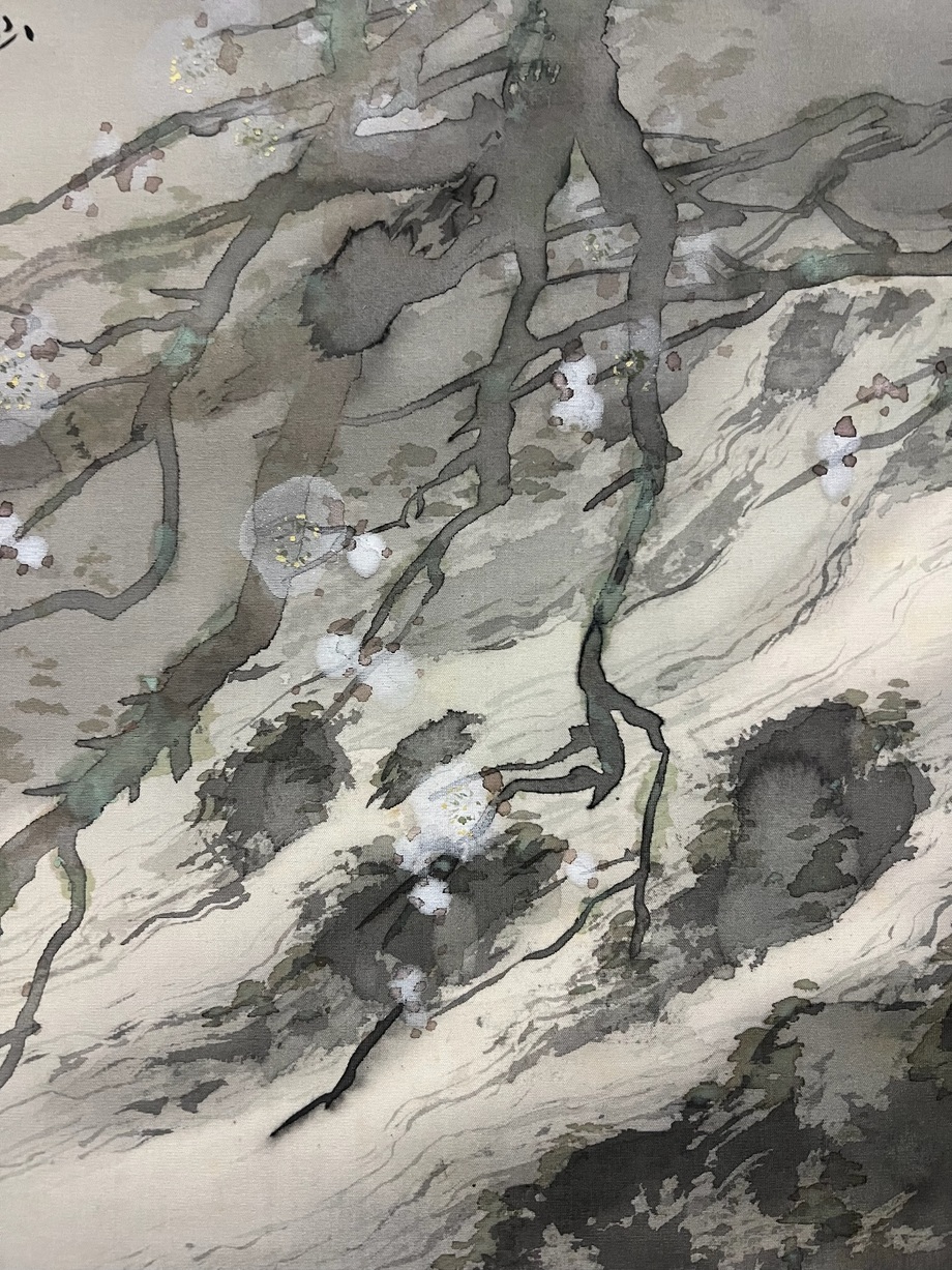梅の花を薄い胡粉で描く事で、自然に咲く梅の水々しさを感じる事ができます。