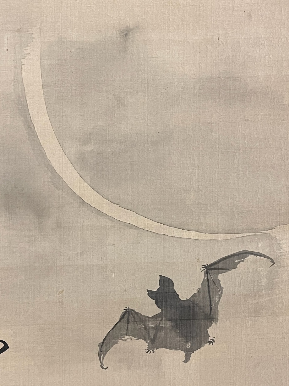 三日月が浮かぶ夕空に、コウモリが舞っています。その下では、人々が一日を終え、家々で夕餉の支度をしている情景を想像されます。記された賛は、「日常の尊さ」をしみじみと感じさせる一句です。画と賛とが相まって、自然(蝙蝠・月)と人の営み(竈の煙)とが静かに響き合い、太平の世における穏やかな暮らしと、一日の終わりの安らぎが表現されています。
