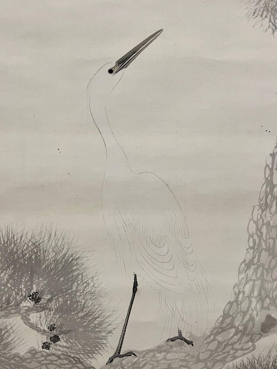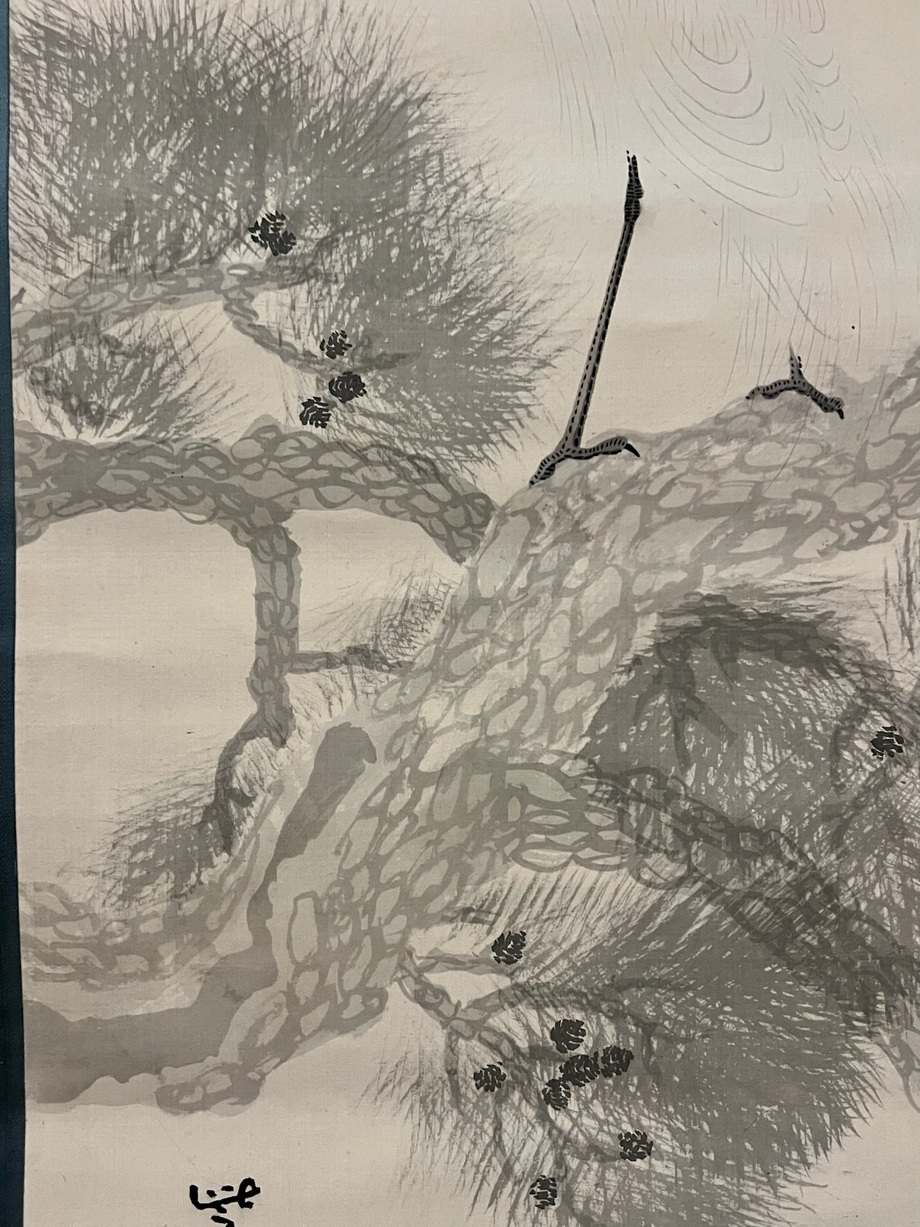 松の表現はダイナミックですが、薄墨を使い、鷺にうっすらと胡粉を入れる事で全体的に透明感が増し、品の良い作品に仕上がっています。