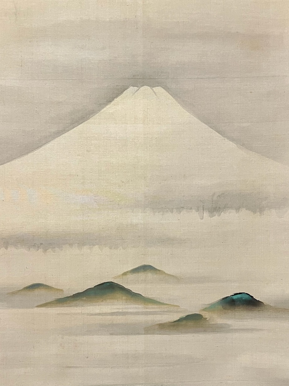 透明感のある水面の藍色と、絹の地の色とが混じりあい、晴れた日の澄み切った空気が感じられます。そこに美しい稜線を広げる富士山の姿が浮かび上がり、何とも晴れやかな気持ちになります。